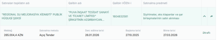 Azərbaycan Dövlət Su Ehtiyatları Agentliyi-nin tabeliyində fəaliyyət göstərən Regional Su Meliorasiya Xidməti publik hüquqi şəxsin Naxçıvan Su Meliorasiya Sistemlərinin İstismarı İdarəsi tərəfindən növbəti satınalma proseduru yekunlaşmaq üzrədir. Yenixeber.org: Söhbət Culfa rayonu ərazisində yerləşən Yaycı-2 nasos stansiyasından Dizə kəndinə çəkilmiş təzyiqli boru xəttinin əsaslı təmiri işlərinin satın alınmasından gedir. Məlumata görə, satınalma üzrə “PUVA İnşaat Tesisat Sanayi ve Ticaret Limited” şirkətinin Azərbaycan Respublikasındakı filialı qalib olub. Tərəflər arasında 635.012,74 AZN məbləğində müqavilənin bağlanacağı gözlənilir. Şirkətin qanuni təmsilçisi Nərimzadə Şadiman Mehman oğludur. DVX-nin açıq mənbələrdən əldə etdiyimiz məlumata görə, qalib elan olunan şirkətin dövlət büdcəsinə vergi borcu mövcuddur. Belə ki, şirkətin vergi borcu 45.586,02 AZN təşkil edir. Qeyd edək ki, 2024-cü ilin iyun ayında Azərbaycan Dövlət Su Ehtiyatları Agentliyinin sədri Zaur Mikayılov əmr imzalayıb. Əmrə əsasən, Zakir Quliyev Regional Su Meliorasiya Xidmətinin rəisi təyin edilib. Qeyd edək ki, dövlət satınalmaları haqqında qanunvericiliyə əsasən, tender prosedurlarında iştirak edən şirkətlərin dövlət qarşısında öhdəliklərinin yerinə yetirilməsi əsas şərtlərdən biri hesab olunur. Xatırladaq ki, mediada dəfələrlə ADSEA rəhbərliyində ailə-quda münasibətlərinə əsaslanan idarəçilik modeli barədə yazılar dərc olunub. Agentliyin sədri Zaur Mikayılov, aparat rəhbəri Fuad Quliyev və müşavir statusu daşısa da faktiki qərarverici şəxslərdən biri kimi göstərdiyi deyilən Əsəd Şirinovdur.(32gun.az)