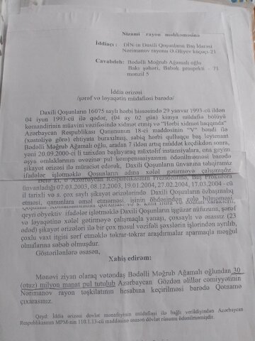 P.S. 162 manatlıq zabit vəzifə maaşına göz dikməyə məcbur edilən DİN-in 1-ci dərəcəli Qarabağ qazisindən DİN DQ 15 ildir 30 (OTUZ)  MİLYON MANAT tələb edir. 1000 manat aylıq pensiya ilə 30 milyonu ödəməyə 2500 (iki min beş yüz)  il gərəkir. 162 manat hesabı ilə isə 15000 (on beş min) il ac-susuz bir yana, kommunal haqqı ödəmədən də sağ qalmağımı istəməlidir DİN, məhkəmə(lər). Vicdan buna necə dözür? Kim vicdansızdır: məhkəmə yolu ilə hüququnu müdafiə edən Qarabağ qazisi, yoxsa bu hüquqa sifarişlə qadağa qoyan məhkəmə (hakimləri)?