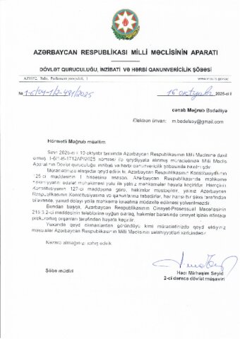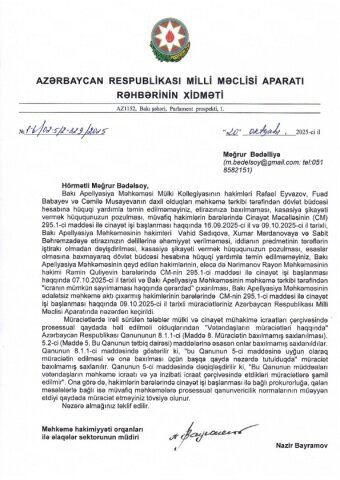 Qanunverici Milli Məclis (Aparatı) məhkəməyə verilir -Məhkəmə hakimiyyətinin özbaşınalığından şikayətlərə baxmadığına görə