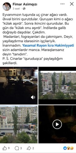 Yenixeber.org: Bu barədə məlumatı yasamal sakini, jurnalist Fimar Asimqızı ictimailəşdirib. Ağacların məhv edilməsini lentə alan sakinin sözlərinə görə, bu qayda ilə artıq üçüncu böyük ağacdır ki, kəsilir: