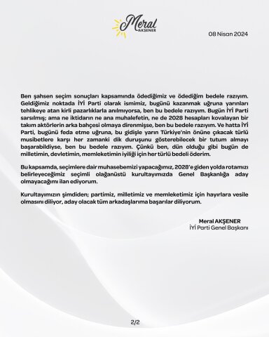 Millətimiz şübhəsiz ki, hökumətə ən əhəmiyyətli mesajı verdi. İYİ Partiya olaraq üzərimizə düşən məsuliyyəti öz üzərimizə götürəcəyik. Biz seçkinin nəticələri ilə bağlı özünütənqidimizi edəcəyik.