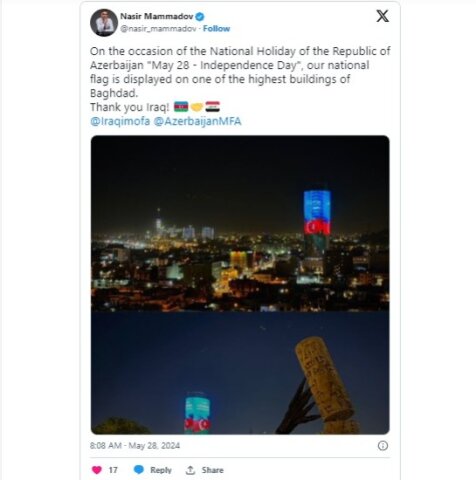 "Azərbaycan Respublikasının milli bayramı, 28 May - Müstəqillik Günü münasibətilə Bağdadın ən hündür binalarından birində dövlət bayrağımız işıqlandırılıb. Təşəkkürlər İraq!", - deyə, səfirin paylaşımında qeyd olunub.