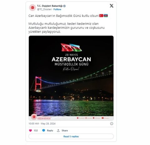 Türkiyə Xarici İşlər Nazirliyi (XİN) Azərbaycan xalqını 28 May - Müstəqillik Günü münasibətilə təbrik edib.