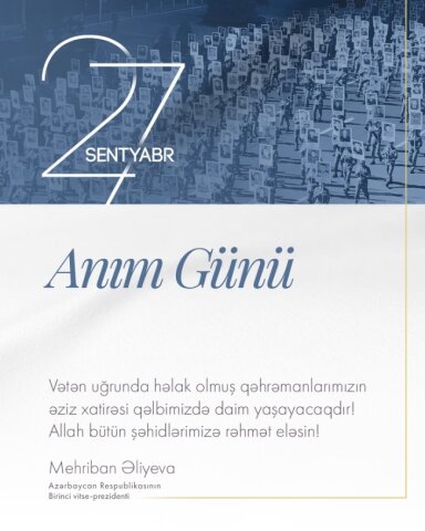 Azərbaycanın Birinci vitse-prezidenti Mehriban Əliyeva "Instagram" hesabında 27 sentyabr - Anım Günü ilə bağlı paylaşım edib.