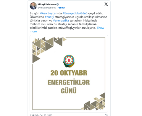 İqtisadiyyat naziri Mikayıl Cabbarov 20 oktyabr -Energetiklər Günü ilə bağlı "X" sosial şəbəkəsindəki hesabında paylaşım edib.