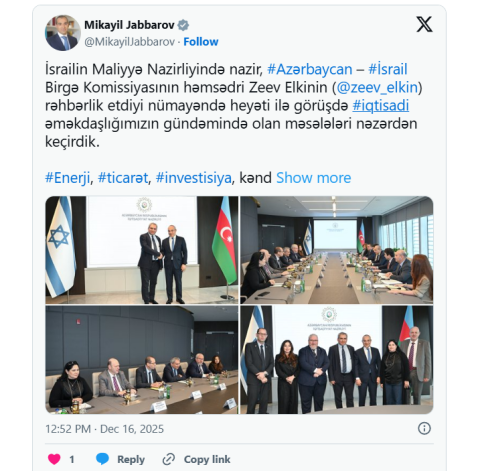 "İsrailin maliyyə naziri, Azərbaycan-İsrail Birgə Komissiyasının həmsədri Zeev Elkinin rəhbərlik etdiyi nümayəndə heyəti ilə görüşdə iqtisadi əməkdaşlığımızın gündəmində olan məsələləri nəzərdən keçirdik. Enerji, ticarət, investisiya, kənd təsərrüfatı, rəqəmsallaşma, innovasiya, logistika və digər sahələrdə qarşılıqlı fəaliyyətin təşviqi, Azərbaycan-İsrail Birgə Komissiyasının 4-cü iclasında qeyd edilən prioritet istiqamətlərdə işbirliyi barədə müzakirələr apardıq", - deyə o qeyd edib.