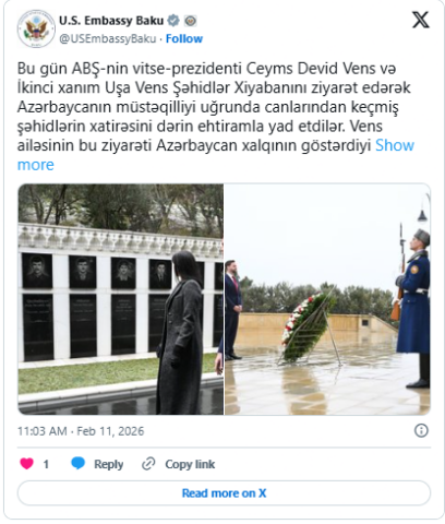 Qeyd olunub ki, fevralın 11-də ABŞ-nin vitse-prezidenti Ceyms Devid Vens və İkinci xanım Uşa Vens Şəhidlər Xiyabanını ziyarət edərək Azərbaycanın müstəqilliyi uğrunda canlarından keçmiş şəhidlərin xatirəsini dərin ehtiramla yad etdilər.