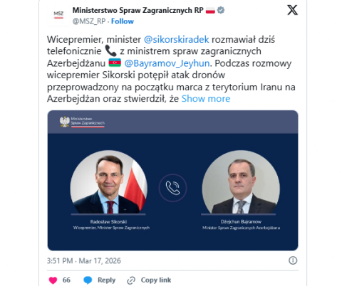 "Nazirlər, həmçinin Yaxın Şərqdə və Cənubi Qafqazda təhlükəsizlik sahəsindəki vəziyyəti müzakirə edib, eləcə də davam edən münaqişənin mümkün siyasi və iqtisadi nəticələrini nəzərdən keçiriblər", - Polşa XİN-dən bildirilib.